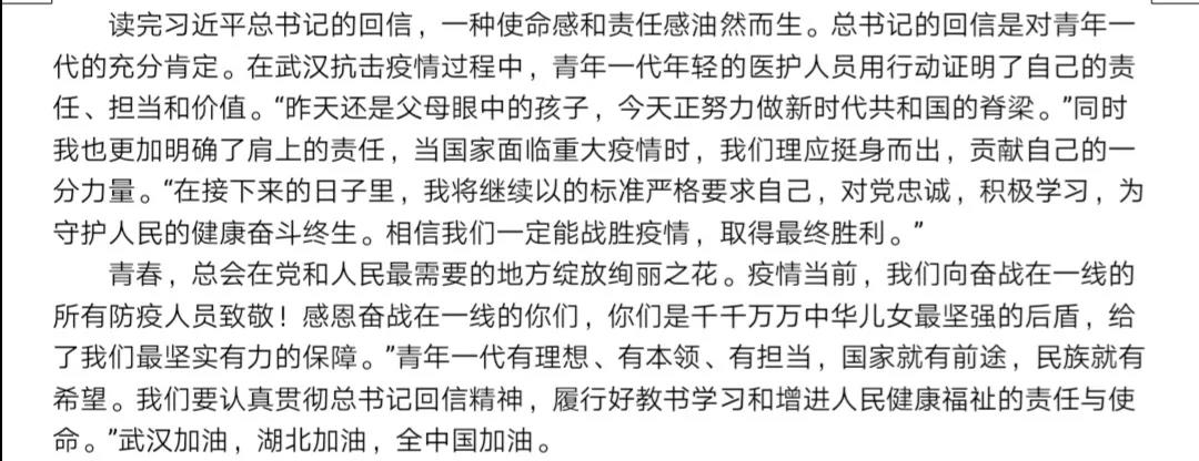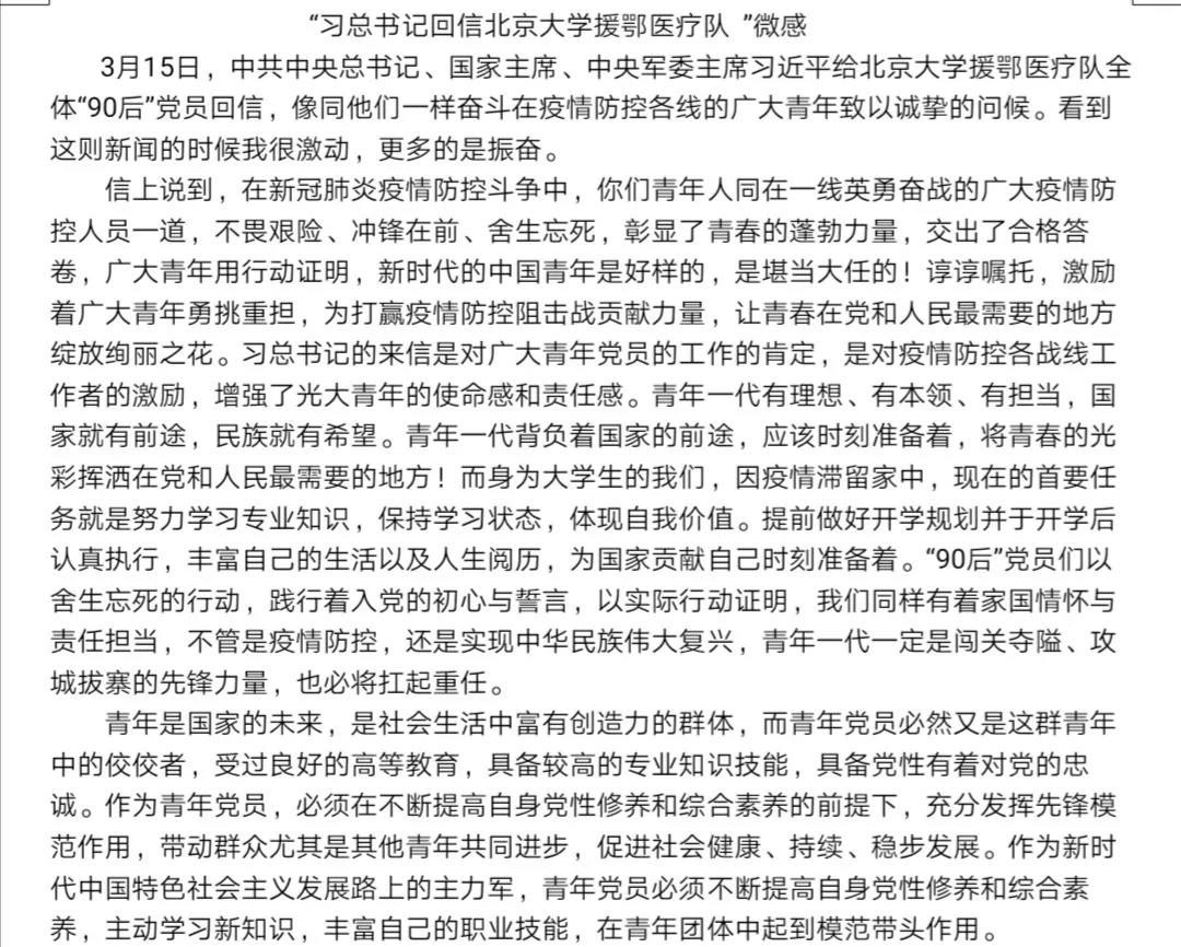 色情网 学生党员围绕“习近平总书记回信”心得体会 作者:李孟帆 来源:色情网 发布时间:2020-07-07 阅读次数: 中共中央总书记、国家主席、中央军委主席习近平3月15日给北大学生援鄂医疗队全体“90后”党员回信,向他们和奋斗在疫情防控各条战线上的广大青年致以诚挚的问候。色情网 17级党员、预备党员,19级各班团支部积极响应号召,感受颇深,执笔写下内心的真实体会。 (审核人:相萌萌)