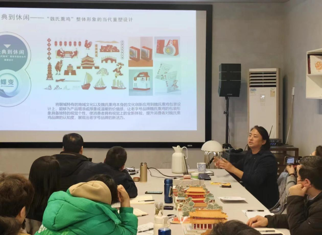 李院长先是结合自身经历讲述当今非遗文化的创新设计,引入主题,然后通过讲解幻灯片的形式,从“非遗老字号”形象创新设计的相关项目的项目简介、研究目的和意义研究成果的主要内容以及成果的研究价值等方面进行讲解。