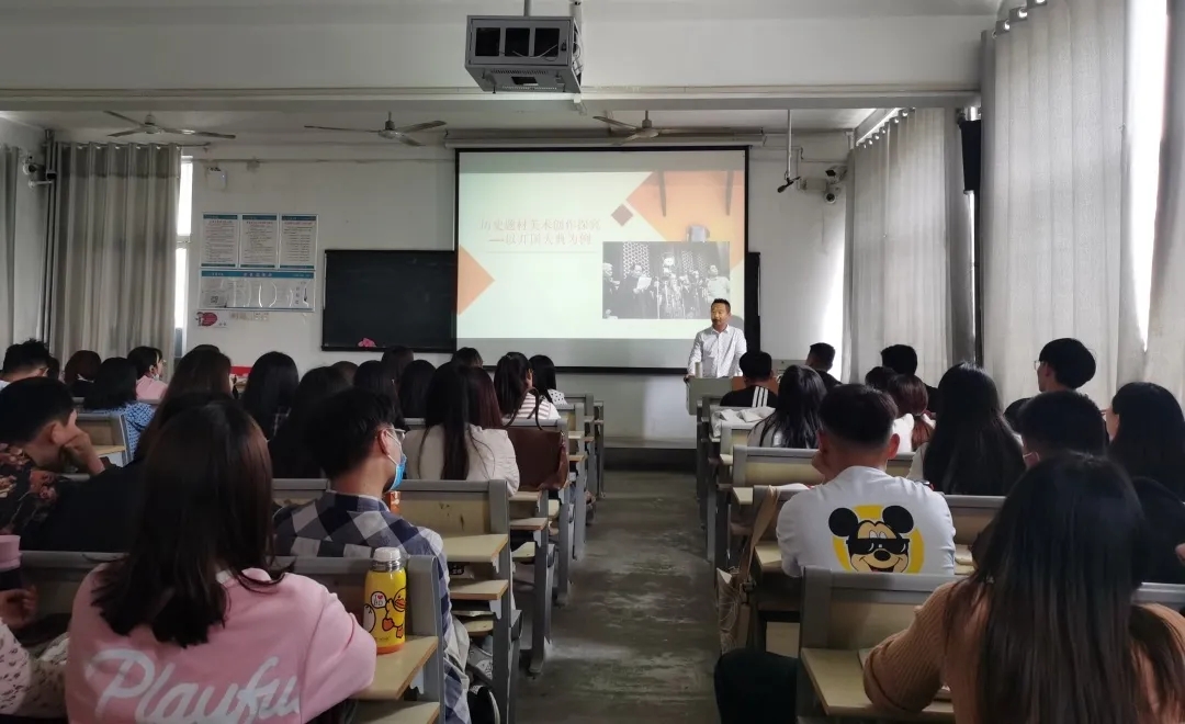 王老师通过精心准备的课件,主要从四个方面分享了历史题材美术创作的相关知识,一是开国大典题材美术作品解读,通过对董希文的油画作品《开国大典》(1952年、1954年、文革时期、文革后临摹版本),唐勇力的国画作品《新中国的诞生》(2009年、2015年),赵力中的油画作品《日出东方·1949》(2007年),马泉的年画作品《中国人民站起来了》(1983年),赵建成的国画作品《换了人间—1949 北京》(2017年),这几幅都是开国大典题材的巨幅力作,从不同角度展现了开国大典最具神圣庄严的时刻,从创作构思(构图)、人物造型、技法表现、艺术共鸣等方面分析,解读了这几幅作品的艺术特色、艺术价值和艺术内涵。二是历史题材美术作品的创作原则,通过开国大典题材美术作品的欣赏与讲解,总结出历史题材美术作品的创作原则应该是还原现场,尊重事实,用一种使命感的心情加之艺术表现的方式方法,挖掘历史题材的精神内涵,再现画面中的人物精神世界,在构思立意中,反复推敲画面中人物的神与势,运用各种手段和方法达到观者和画面中人物的精神交流。三是历史题材美术作品的创作方法,即收集资料,身临其境(收集图片资料,可以通过图书馆、档案馆、网络等途径;通过实地考察——登临天安门城楼,感受实地,感染气息;反复观看影视资料,收听音像资料,揣摩人物动态和心态,激发灵感。),草图推敲,运筹帷幄。四是又通过分析其他历史题材美术作品,如:詹建俊的油画作品《狼牙山五壮士》(1959年),靳之林的油画作品《南泥湾》(1964年),韩硕的国画作品《热血》(1999年),杨立舟、王迎春的国画作品《太行铁壁》(1984年)等,引发的创作启示,即天人合一,师法自然;独辟蹊径,锐意进取;根植传统,文化自信;等等。