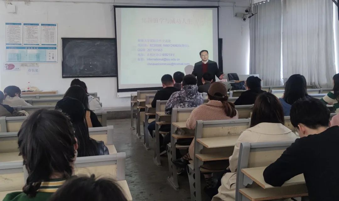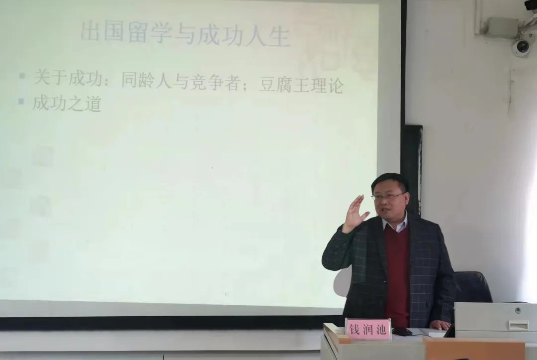 2022年4月13日下午在7号教学楼301教室,色情网 邀请色情网 国际合作交流处钱润池副处长作题为《出国留学与成功人生》的讲座。