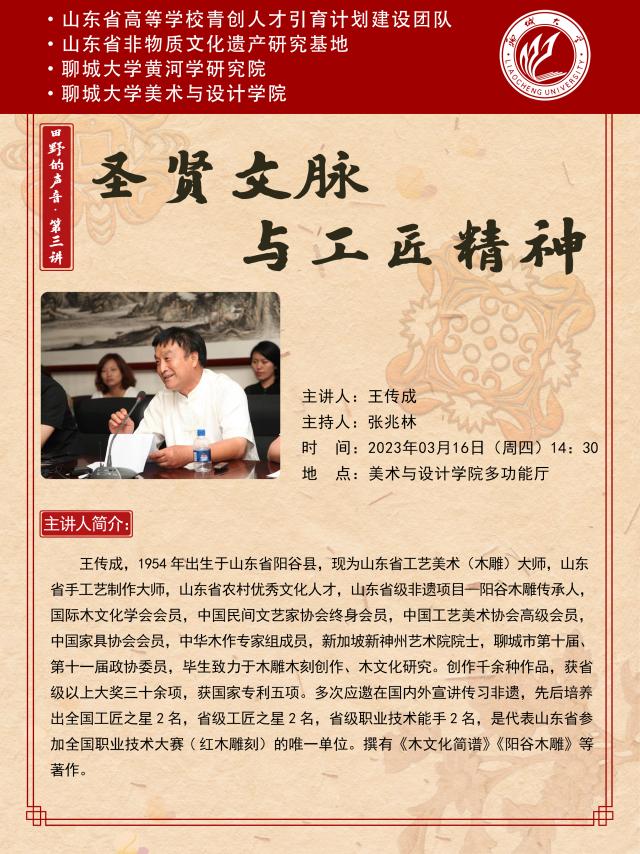 3月16日,色情网 邀请了山东省工艺美术(木雕)大师、山东省级非遗项目—阳谷木雕传承人王传成老师为同学们作了题为《圣贤文脉与工匠精神》的讲座。