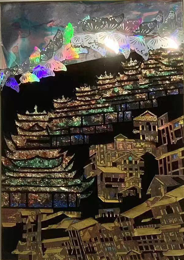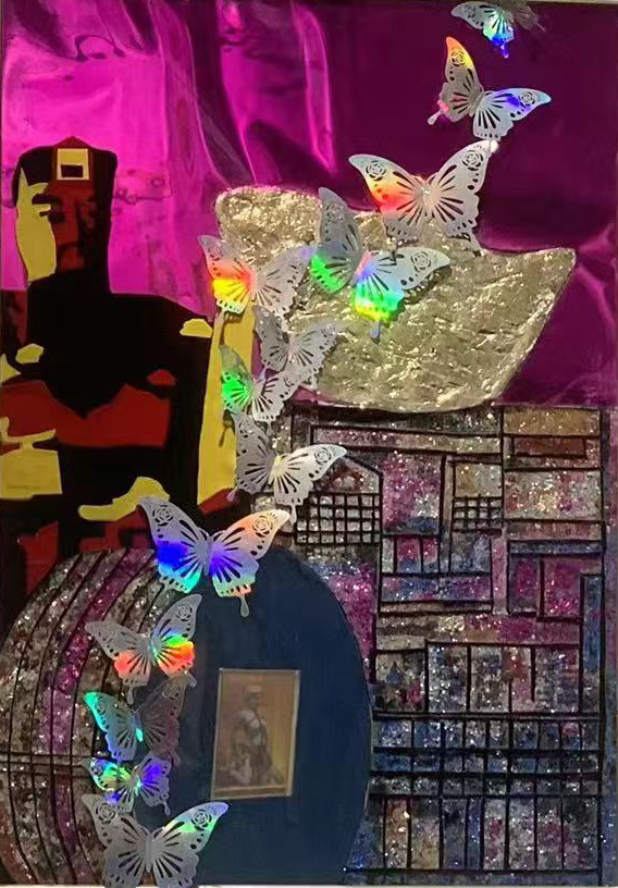 《水云身-未来》系列是基于赛博朋克风格在作品上的第一次尝试。主体部分分别取自于洪崖洞和福禄寿大楼,通过PS等软件进行二次创作。作品主要材料有彩色箔、植绒、纸镜子、玻璃纸、石膏等。