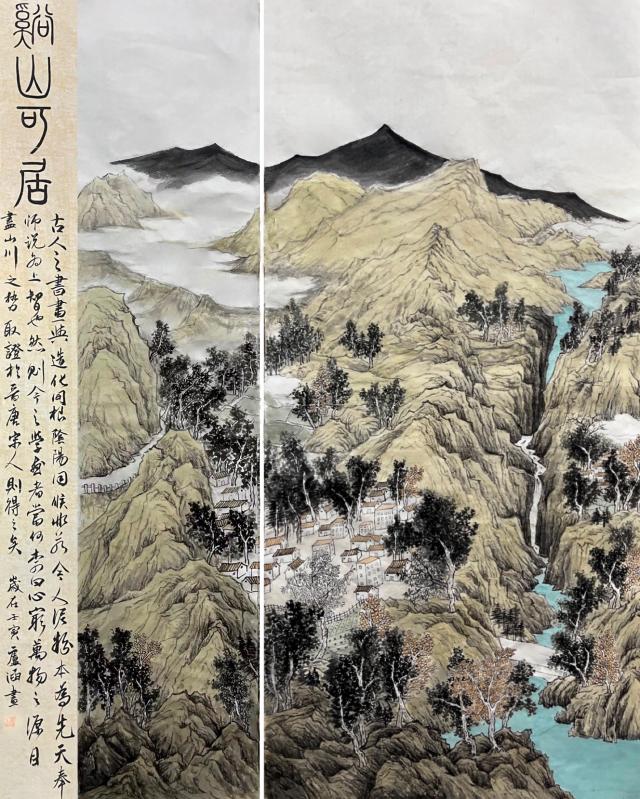 《溪山可居》采用充实、丰富的饱满型构图,受前人启发,在创作之初深入传统皴法,从中寻找独特的表现语言,不断继承与发掘其中的精华并与新时代同向。画面中在加强山体主体结构的基础上少笔勾勒,精心添置的点景与修建的房屋道路,体现出山溪中乡村蒸蒸日上的场景,展现新时代人与自然和谐生存的美好画面。