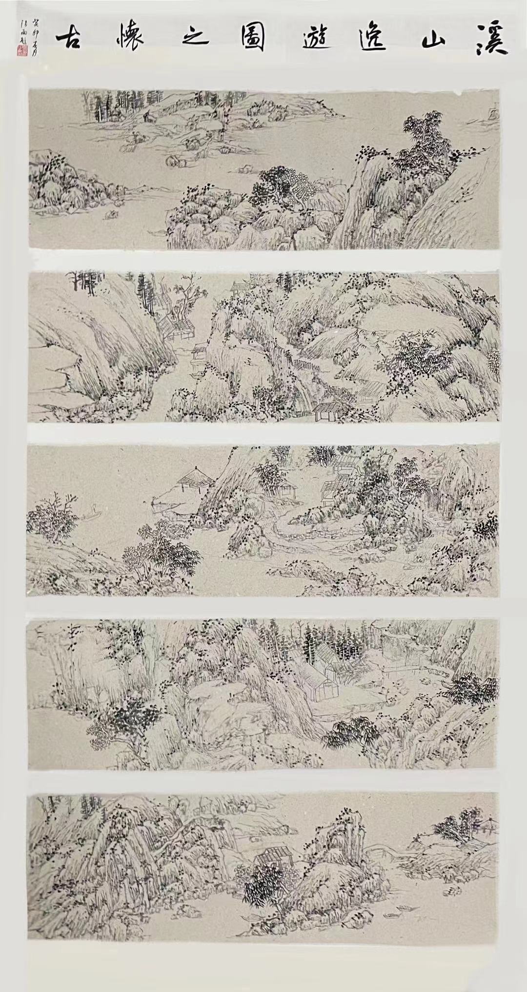 《溪山逸游图之怀古》是《溪山逸游图》系列作品的其中之一,整个系列作品将不同的景色分段表现,各段风景皆有不同。此外,画者运用传统的笔墨技法,传统的构图方式,表达了画者对于传统水墨中国画的热爱,也体现了画者对于古人云游山水的憧憬与向往。