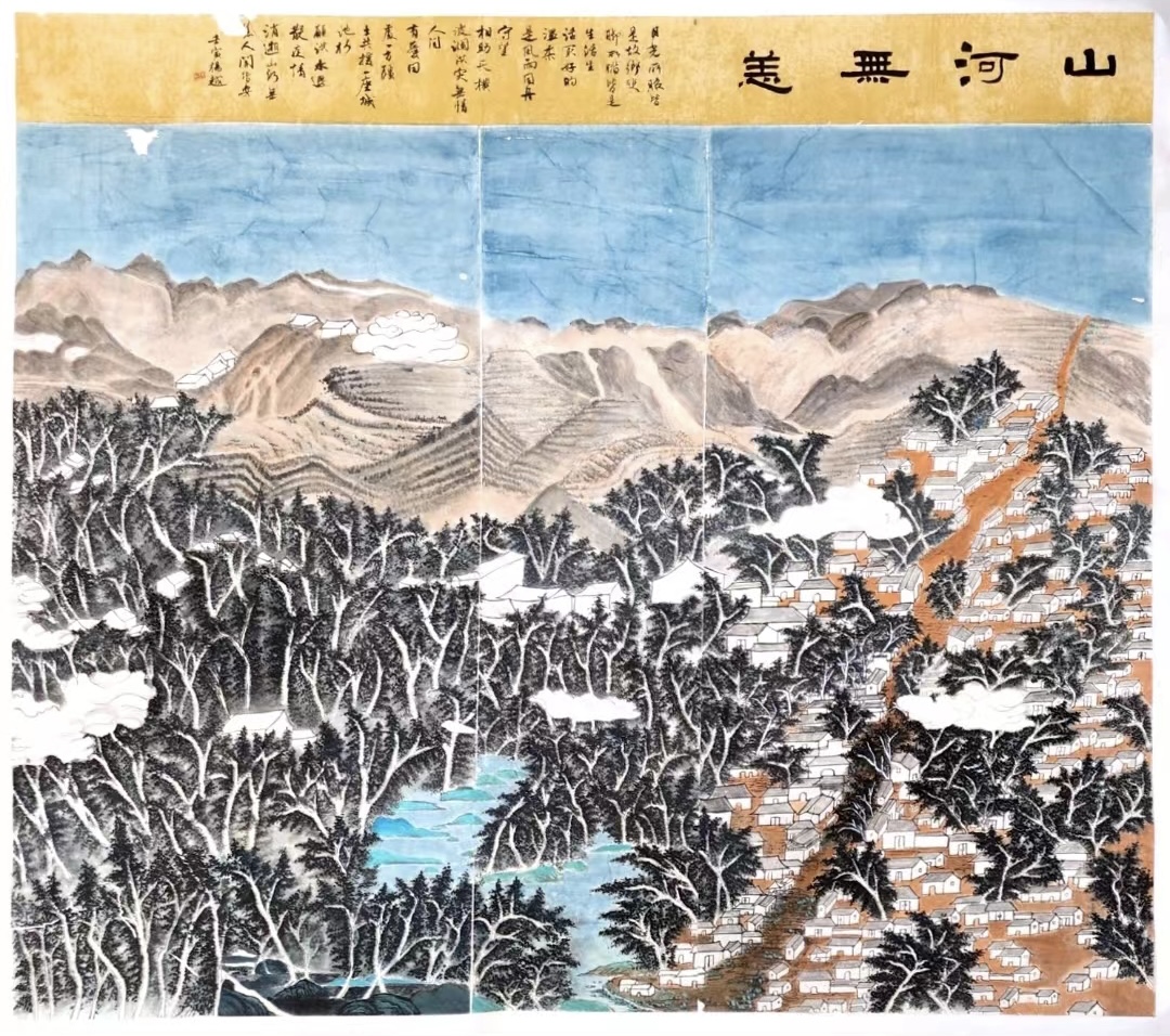 画面中用树、石、房屋等简单的物象进行深层次的理想探寻。祖国大好河山在经历过挫折后依然河清海晏,百姓也安居乐业。