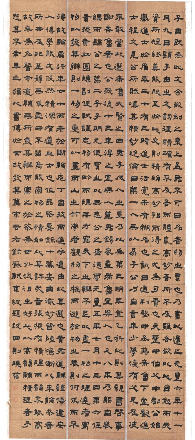 此作内容选自苏轼《东坡题跋》,书中阐述的以个人性情为主体的书法理论,如“我书意造本无法”、“书初无意于佳乃佳”等观点,对后世书家影响极大。作品拟《鲜于璜碑》笔意,用笔劲健挺拔,波磔迅疾犀利,中宫至密,外部舒宕,意欲传达遒劲古朴和纵逸恣肆的主观审美追求。