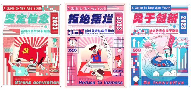 “青年一代有理想、有本领、有担当,国家就有前途,民族就有希望。”该作品以新时代为主题,提炼出“坚定信念”“拒绝摆烂”“勇于创新”三个关键词为主进行创作,采用孟菲斯风格进行设计,以展现青年一代有担当、讲实干、勇创新的时代理念,以此启发青年一代牢记青春使命,在新时代的建设上,绽放出绚丽的花朵,奏响新时代出彩乐章。