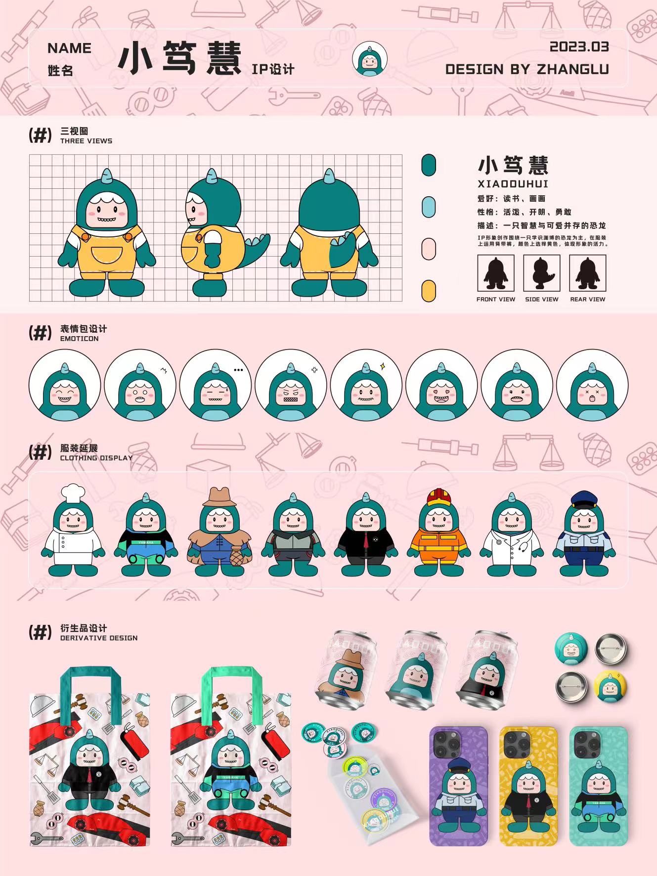 此IP形象以学生为设计主体,采用恐龙的外表,表达学无止境。以“小笃慧”作为IP的名称,意为睿智聪明、很有智慧。主形象采用背带裤的服装设计,体现学生群体阳光、积极的特点。结合表情包和不同职业的典型着装,代表学生群体的活泼可爱和职业发展的多样性。