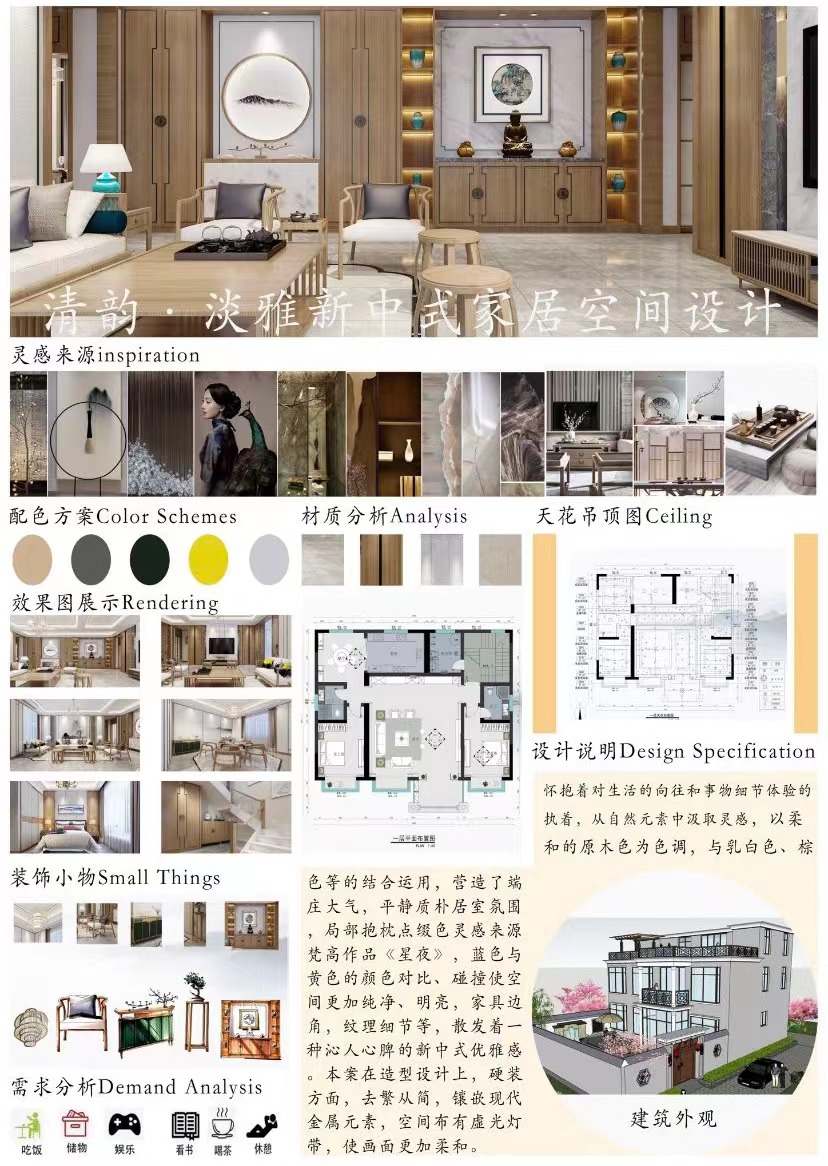2021年3月作品《清韵·淡雅新中式家居空间设计》荣获2021学院杯中国室内与环境设计大赛入围奖;