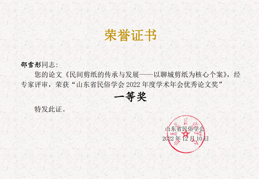 2022年12月论文《民间剪纸的传承与发展——以聊城剪纸为核心个案》荣获“山东省非物质文化遗产资源挖掘与保护传承”学术研讨会一等奖;