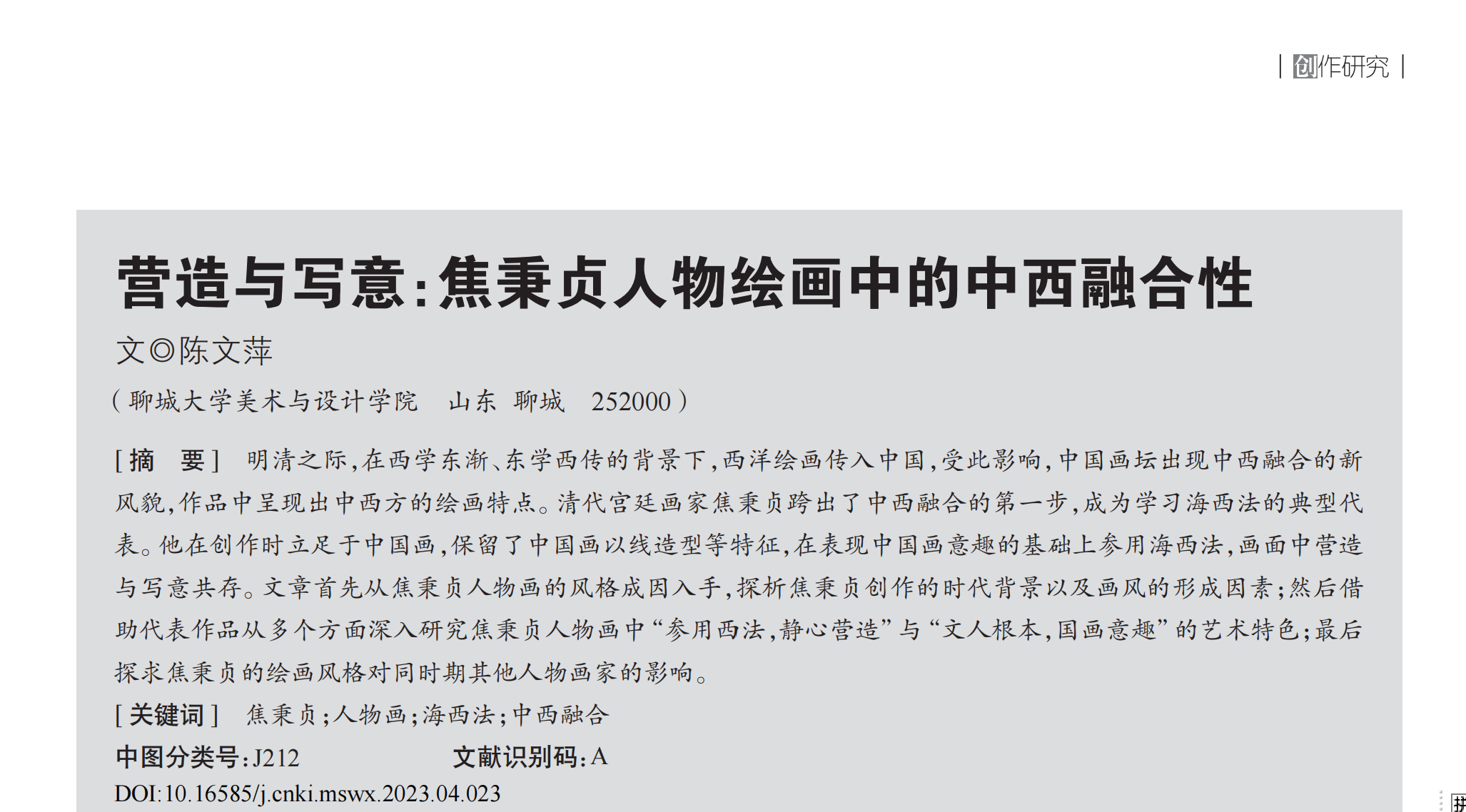 2023年4月论文《营造与写意:焦秉贞人物绘画中的“中西融合”性》发表于《美术文献》。