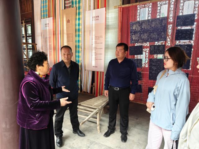 鲁锦织造技艺牡丹区传承人邓红英接待了考察团,陪同参观了菏泽鲁锦文化展示体验中心的文化展示、布料展示、工艺展示、精品展示、主题墙、时光长廊、研学体验、现代生活场景及古代生活场景运用等文化板块,详细介绍了鲁锦织造的纺线、练染、布浆、挽经、做综、闯杼、掏综、织布等72道工序,并就鲁锦织造的保护传承进行了深入交流。