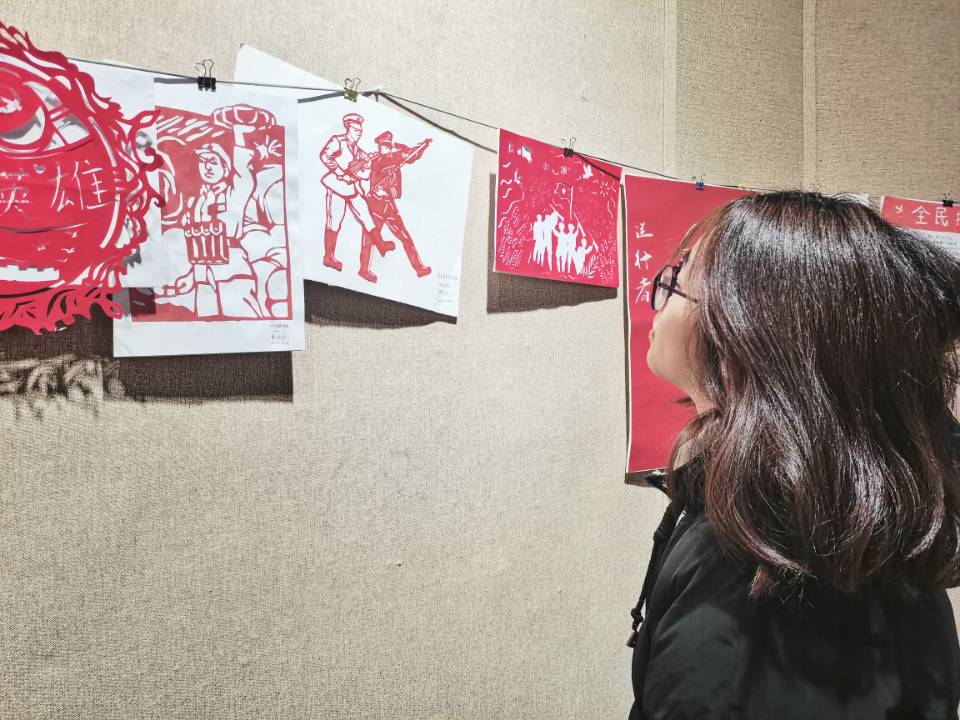 随着时日渐进,来自各个学院的剪纸作品被收集整理布置于展厅。红色的剪纸作品整齐布列于墙面,诉说着抗战时期英勇善战的英雄们的故事,转述着对南京大屠杀中无辜群众深深的哀悼。12月13日是第七个南京大屠杀死难者国家公祭日。公祭无辜死难之生命,告慰血与泪浸染之土地。这一天,举国上下以各种形式深切缅怀死难同胞,深切悼念。剪纸是一种用剪刀或刻刀在纸上剪刻花纹,用于装点生活或配合其他民俗活动的民间艺术。 其传承的视觉形象和造型格式,蕴涵了丰富的文化历史信息,表达了广大民众的社会认知、道德观念等。轻薄的剪纸上,背负着深重国殇。
