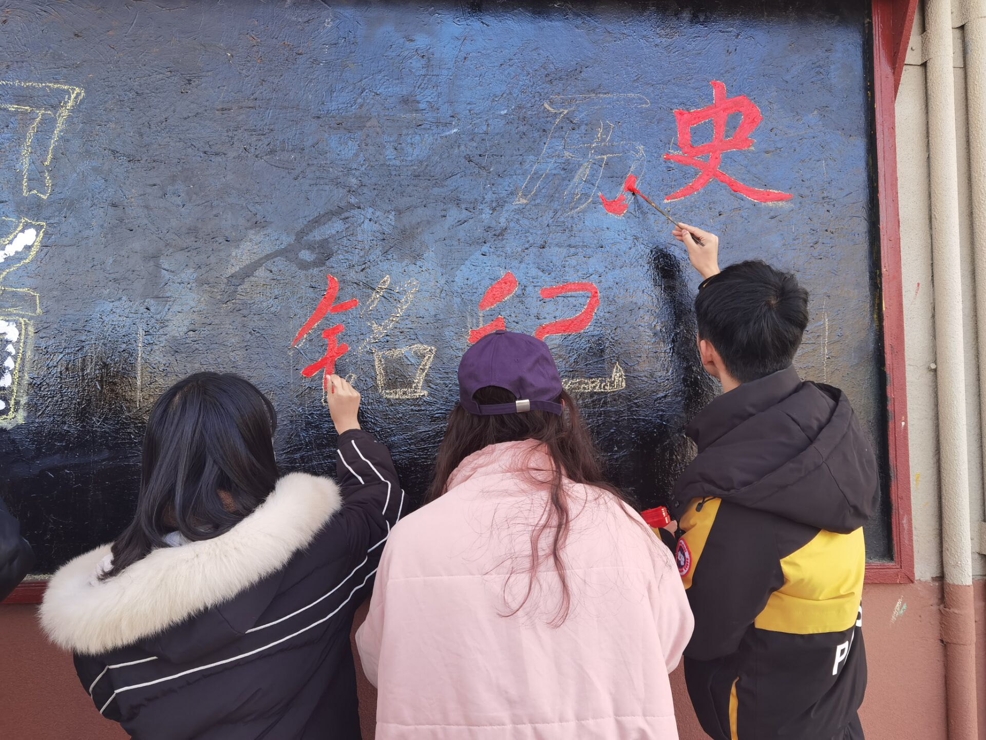活动开始,志愿者们明确分工,事先准备好工具,你起型我上色,认真地讨论板报中绘画时的细节。不管时代如何变迁,先烈们舍生忘死,前赴后继,为他人谋幸福的高尚品德不应该被遗忘,志愿者们也表示也应该尽最大努力把先烈的精神体现出来,把对祖国的热爱定格在丰富多彩的黑板报上,让更多人可以切身感受到。制作板报的过程中,志愿者们笔下鲜亮的“屠”字以1937作为偏旁部加上“者”鲜明的突出了板报主题,吸引了众多同学观望,志愿者们热情地与围观同学们交流,向同学们讲解以"南京大屠杀"纪念日为主题的板报设计,那是不容忘记的史实,也是作为中华民族曾经的屈辱。同学们制作板报希望学院同学可以勿忘国耻,铭记历史。