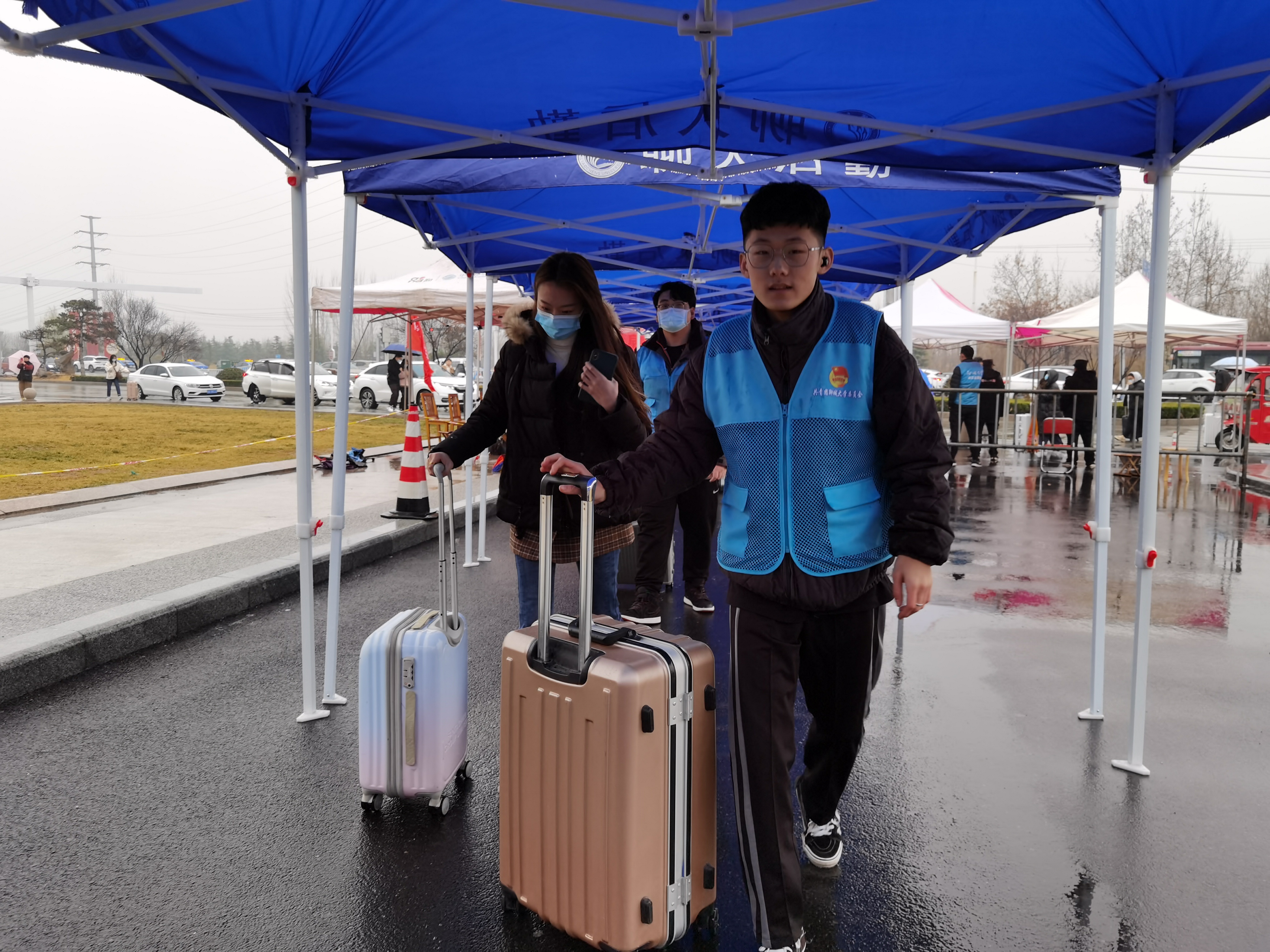晨光破晓,天色微亮,一顶顶小帐篷整齐排列着。志愿者、老师们已早早到位,他们身穿鲜艳的红马甲,等待着同学们的到来。学生佩戴口罩,进行行李箱消毒,测量体温,出示健康二维码、易班返校码,进行验证,每一个步骤都必不可少。由团委辅导员孔德滕老师带领志愿者们工作,色情网 易班服务中心的工作人员守在门口处进行一一核对,志愿者和老师们贴心地服务每位同学,引导他们进入校门、帮助他们一遍又一遍地搬运行李。细雨朦胧中,他们的身影显得格外耀眼。直到每一位同学都上了校内公交车,他们才又抓紧时间回到校门口,帮助后来的同学。有了志愿者们的配合,返校工作更加的有序。即使到了晚上,志愿者们也依旧不放松,坚守在岗位上,帮助每一位返校同学进行登记工作。