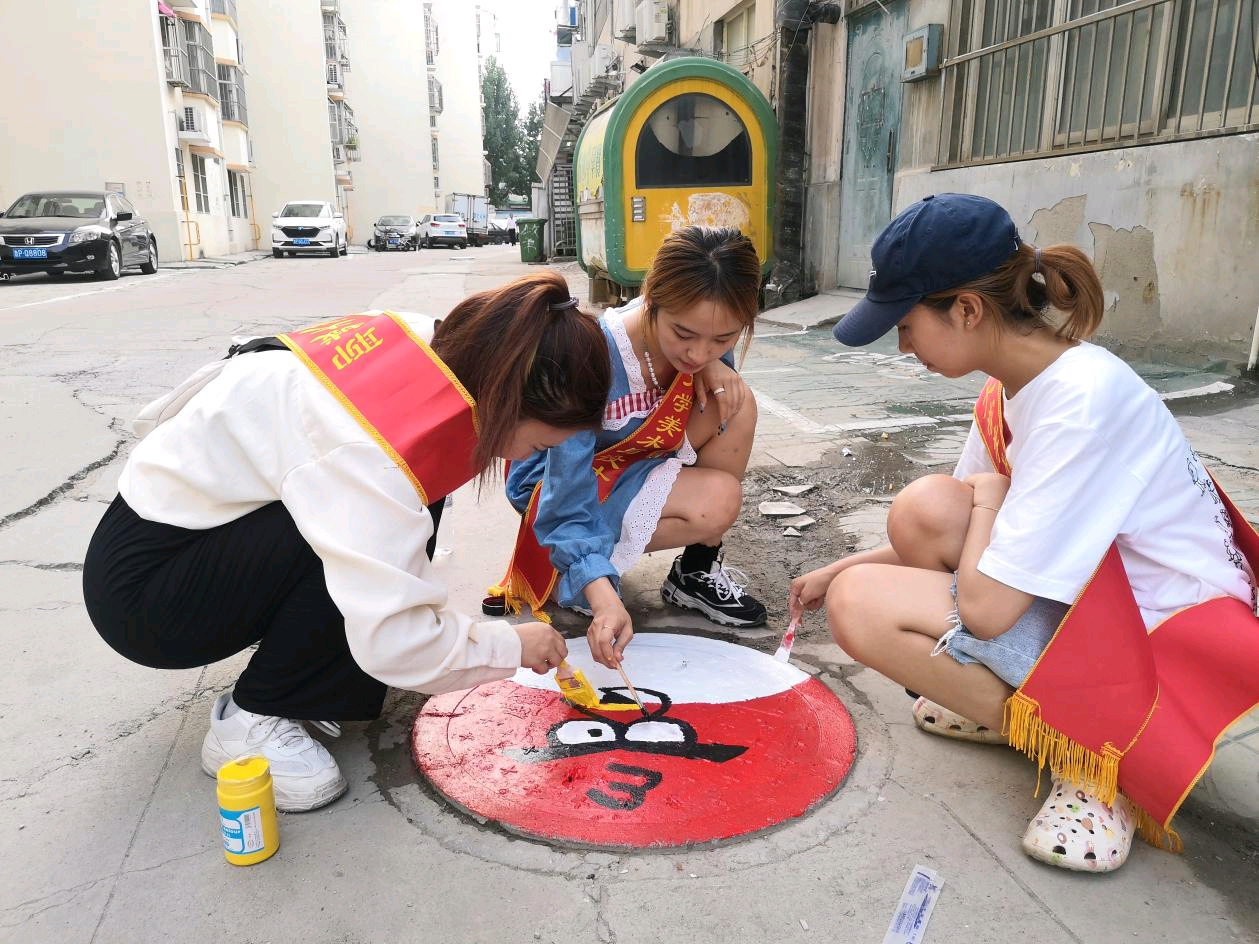 宣传的主要对象为社区老人与孩子,考虑到其对于志愿者与宣传工作可能产生心里上的抵触感,志愿队决定从人们身边常见但不显眼的东西——井盖入手,利用专业特长,为其绘制装饰,拉近与社区居民的距离。12日上午,志愿队来到社区,在与社区居委会相关负责人交流后,立刻开始了行动,志愿者们先从一些有趣的图形着手绘制,并穿插一小部分的法律宣传内容。妙趣横生的图案,引得部分老人与孩子驻足观看。见时机成熟,志愿者们便开始绘制以法律为主题的图案,绘画内容的变化,首先吸引了孩子们的注意,纷纷开始询问志愿者绘制的图案是什么意思,由孩子开头,老人们也与志愿者们开始交谈,志愿者们也借机向社区老人介绍自己此行的目的,而老人们也开始讲述自己对于依法治国的认知。在经过一上午交流后,志愿者与社区老人孩子拉近了距离,充分了解了双方的情况,为后续展开的宣传活动做了铺垫。