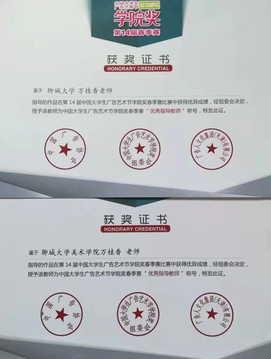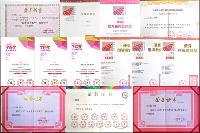 指导学生参加由中国高等教育学会、中国广告协会等单位主办的全国大学生广告艺术大赛、中国大学生广告艺术节学院奖、金犊奖等重要专业设计大赛,所指导的学生获得各级奖项150余项,个人荣获“优秀指导教师”荣誉称号十余项,并两次获得色情网 优秀班主任荣誉称号。