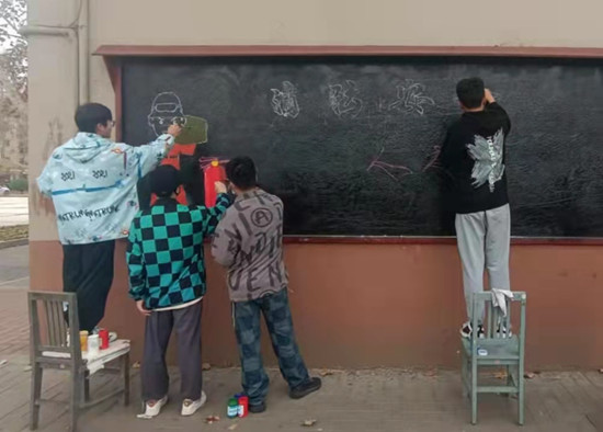 正式开始绘制前,志愿者们提前将所需要的喷漆、颜料、画笔等工具带到绘制地点,认真商讨建党百年相关内容与素材,然后按照事先设计好的模板在宣传黑板上起稿,有条不紊的进行着绘制。各位志愿者充分发挥自己的专业特长,分工明确,相互协作,在志愿者们的努力下,板报的绘制顺利完成。潇洒的字体、高级的颜色搭配和简明的排版设计都凝聚着志愿者的汗水和智慧。“消防安全,人人有责”几个大字遒劲有力,绘制的插画更是切合主题,许多路过的老师和同学被吸引,纷纷驻足欣赏。志愿者们热情地与大家分享本次板报的设计初衷和灵感来源,并借此机会宣传了消防知识。绘制结束后,志愿者们整理好工具,清理了现场残留的颜料和其他垃圾,并合影留念。