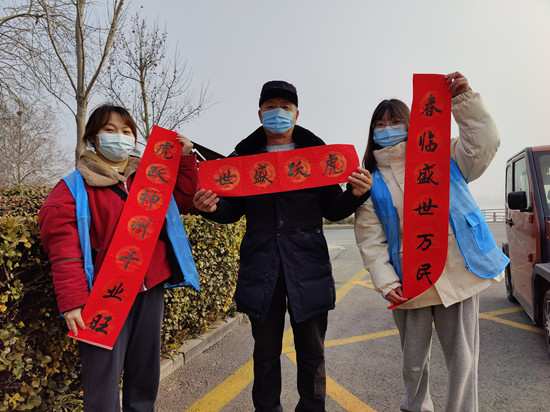 为了传承中华民族优良的文化传统,发展非物质文化遗产,促进当代大学生对传统文化的继承与理解,让同学们在喜庆的节日里营造出欢快的气氛。1月18日,色情网 “同心燃梦”志愿服务队于东昌湖公园举办“迎客迎友迎新年,送喜送福送春联”活动。