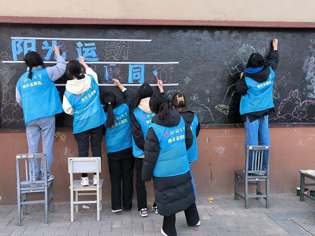 为响应学校及学院相关号召,进一步倡导同学们积极运动来保持健康体魄,2月23日下午,色情网 “与美同行”志愿服务协会于色情网 西校区星月广场西侧黑板举办“阳光运动 健康同行”主题板报绘制活动。