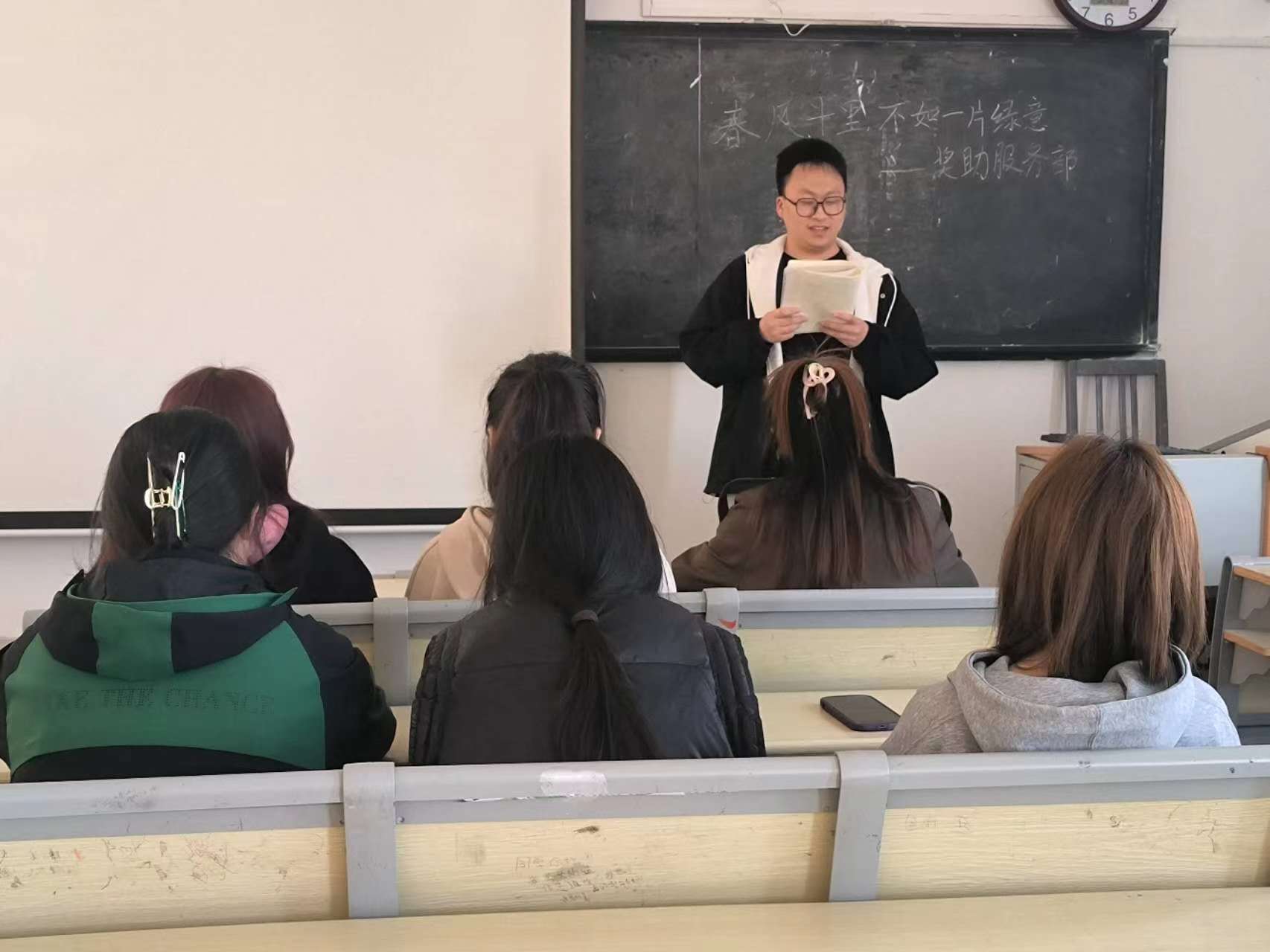 活动一开始,负责人便向参与的同学们介绍了活动的目的,讲解了植树节的由来和重要意义,紧扣活动主题,围绕具体问题进行探讨。接着所有参与人员依次上台朗读自己的征文,朗读者们都声音洪亮,字正腔圆,语言生动,饱含着自己的真情实感。文章内容则是围绕植树节开展,讲述了植树的重要性以及作用,朗读过程也使得每位活动参加者们领悟到了植树节在不同方面的意义。接着主持人还组织同学们探讨关于植树的经验及其方式,大家也都踊跃加入并积极发表自己的观点。活动尾声,负责人还呼吁大家多参与植树活动,保护花草树木,从而营造良好生态。最后在大家的有序离场下,本次活动宣告结束。
