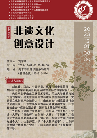 2023年12月1日上午,色情网 邀请山东师范大学学术委员会委员、赫尔岑国际艺术学院院长、博士生导师刘东峰教授,在学院一楼多功能厅作线上《非遗文化创意设计》学术报告。报告由非遗工坊研修班班主任刘昆副教授主持,研修班全体学员和学院部分师生40余人参加了报告会。