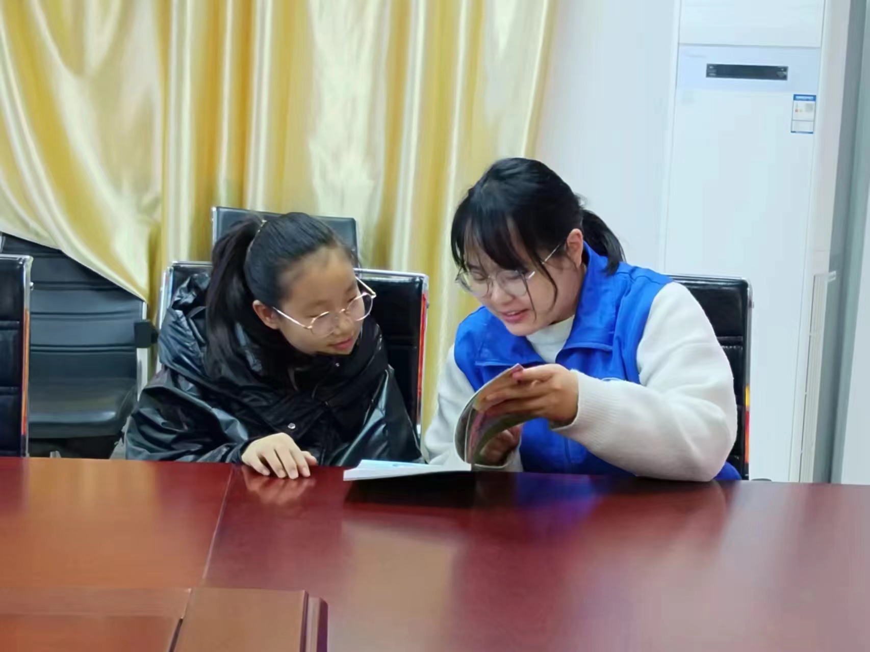 活动伊始,志愿者为小朋友们分发书籍,并陪同小朋友们一起阅读书籍,为小朋友们讲解书中的内容。阅读过程中志愿者们与小朋友们就书中的内容展开讨论,积极表达自己的见解,在体会阅读乐趣的同时也让小朋友进一步理解读书的意义。同时志愿者们开展猜词接龙活动,用小游戏来提高活动现场的气氛,调动小朋友们的积极性。活动进入后半程,志愿者们引导小朋友们用带有书法字迹的折纸进行书签的制作。小朋友们发挥各自的想象力和艺术才能,用灵巧的双手剪、折、拼、贴制作出一枚枚美观大方,创意十足的书签。这些枫叶书签融趣味性、实用性于一体,简单却不失内涵,稚拙又不乏美感。活动的最后志愿者们与小朋友们拿着制作的书签合影留念,为今天的活动画下一个圆满的句号。