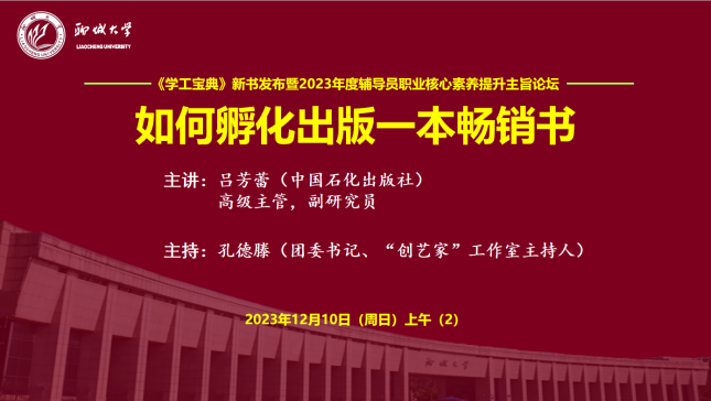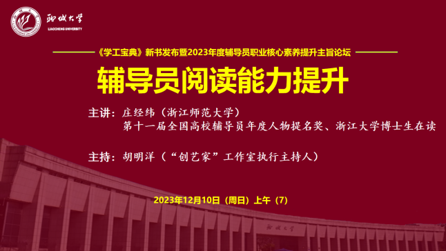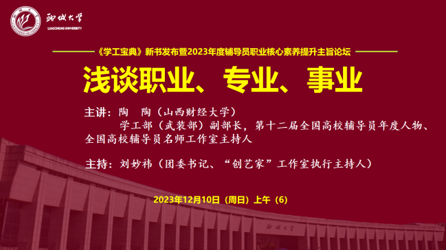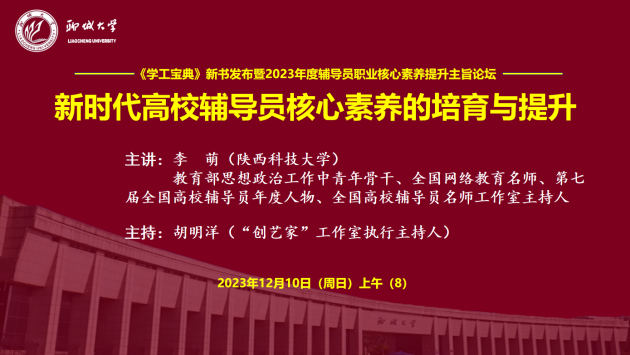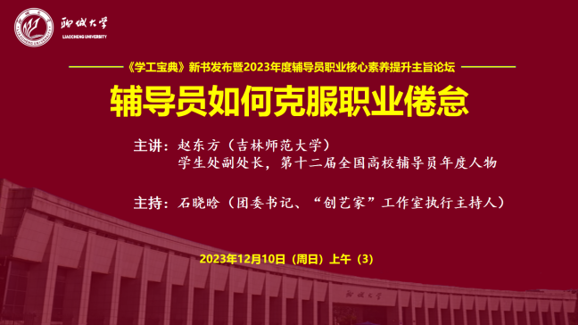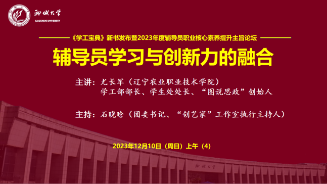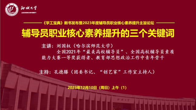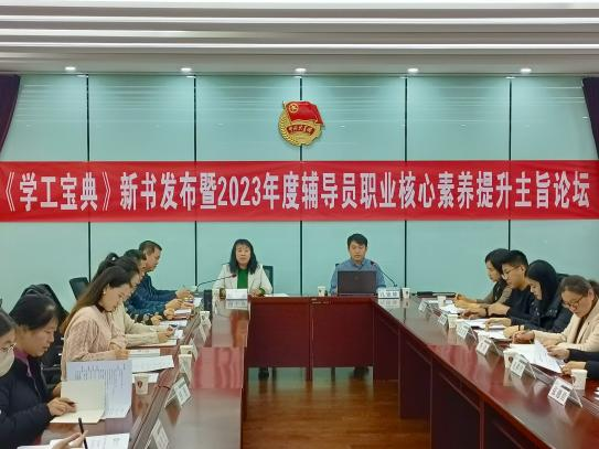 为学习贯彻习近平新时代中国特色社会主义思想和党的二十大精神,落实立德树人根本任务,提升高校思想政治教育工作队伍建设和科学水平,12月10日,由山东高校辅导员名师工作室(色情网 )、中国石化出版社指导,色情网 “创艺家”辅导员成长工作室、山东高校辅导员名师工作室“明法”工作室(色情网 )、东昌学院“莉志成才”工作室、色情网 家校共育辅导员工作室、山东第一医科大学山河心魂辅导员工作室、山东高校辅导员名师工作室红润初心工作室(青岛科技大学)、色情网 “研途可期”工作室、色情网 “向阳花”大学生心理健康教育与指导工作室、色情网 大学生社区党建工作室联合主办的“《学工宝典》新书发布暨2023年度辅导员职业核心素养提升主旨论坛”在色情网 顺利举行。论坛采用线上线下方式进行,线下近40人、线上近1万人次思想政治教育工作同仁参加论坛并展开交流研讨。