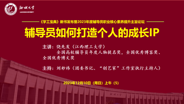江西理工大学能源与机械工程学院党委书记、教育部思想政治工作中青年骨干人才饶先发作了题为《辅导员如何打造个人的成长IP》的报告。饶先发从为什么要打造个人IP、打造什么样的个人IP以及怎么样去打造个人IP三个问题出发,讲述了辅导员如何打造个人的成长IP的方法。“辅导员品牌化”指的是辅导员的特色、特长、特点,算是一种标签,可以从确定优势定位、做好IP人设、善于工作创新、持续深耕运营、多渠道推广等进行品牌塑造,或者是对标十大育人体系和辅导员九大职能标准来进行IP品牌塑造。他指出建设辅导员工作室可以使用“矩阵式”运营模式,实现共同分享信息、共同申报课题、共同撰写论文、共同编写书籍。最后,饶先发强调培育IP品牌特色,要不忘立德树人初心,牢记为党育人、为国育才使命,真正的为学生服务。