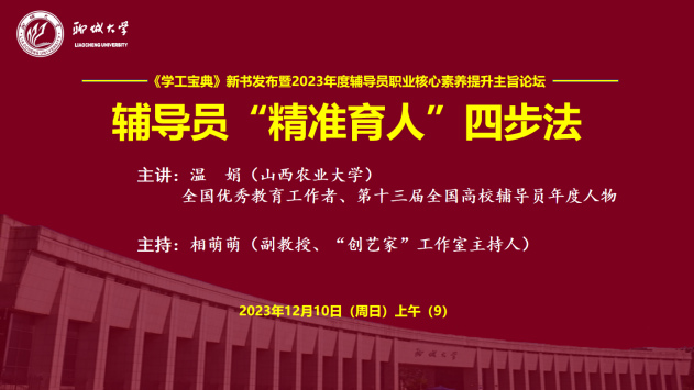 山西农业大学公共管理学院党委副书记、第十三届全国高校辅导员年度人物温娟作了题为《辅导员“精准育人”四步法》的报告。她坚持把握学生主体性教师主导性、漫灌和滴灌相结合、因材施教和因需供教相结合的原则,围绕精准把握育人对象、精准营造育人氛围、精准选择育人方法、精准掌握育人艺术四步法,就怎么样“精准育人”展开详细阐述。温娟强调,要注重不同学生群体和个体特点,要选用重要的时间节点、不同场所、身边榜样人物、发生重要事件育人,要注重“面对面”“线对线”“点对点”的育人方法,要把握时机、立规建制、借力打力的育人艺术,精准育人,精准育己,一路向阳。