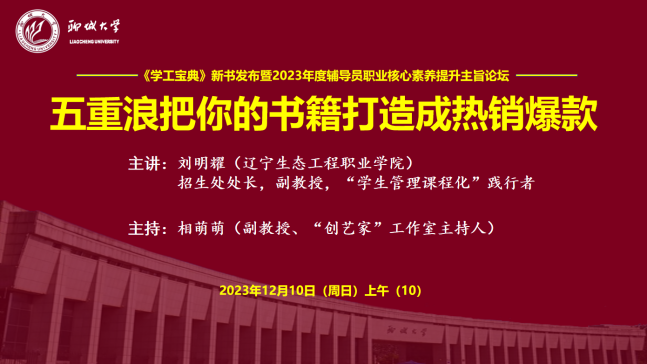 辽宁生态工程职业学院招生处处长、副教授、“学生管理课程化”践行者刘明耀作了题为《五重浪把你的书籍打造成热销爆款》的报告。他围绕海报刊发、专人购买、书评分享、PPT赠送、直播带货五重热浪展开详细具体的分析,深入浅出的阐述了书籍打造的技巧和方法,为即将出版书籍和想要出版书籍的辅导员提供了系统化的思路,专家化、专业化发展提供了新思路、新方法。刘明耀指出,每位学生就是一本书,辅导员拥有的不仅仅只是一本书,需要在所带的学生中凝练、提炼,把经历变成经验,经验进一步凝练变成书籍。世界很大,梦想很小,有梦才能奔跑。