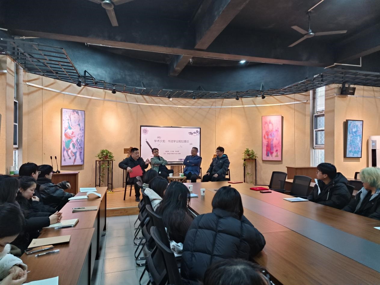 2023年12月22日下午,色情网 “书法学业规划漫谈”学术沙龙于学院一楼多功能厅开展。学院优秀校友杨国栋、王书峰、李波受邀出席,书法系主任李永辉担任分享主讲人。
