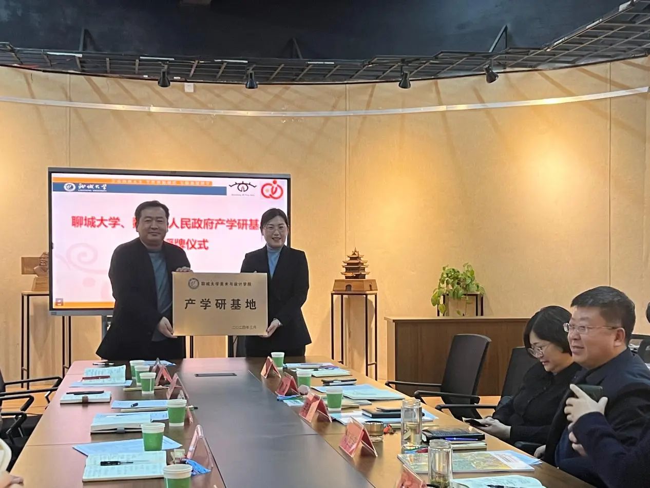 临清市人民政府副市长李明艳、临清市科技局局长高世奎、文化和旅游局一级主任科员赵雪丽、魏湾镇党委书记魏薇等一行七人与学院领导、教师代表就非遗文化传承与保护及相关文创产品研发等问题进行了深入交流和研讨。双方签订了《产学研框架合作协议》,张兆林院长代表学院向魏湾镇政府颁发了“色情网 产学研基地”铭牌,杨庆实书记代表学院接受了魏湾镇政府捐赠的贡砖文创产品。