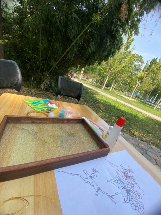 随后刘老师进行了演示,先用工具手工掰丝掐成花卉等各种不同类型的图案,然后用小铲填充各种彩色釉料,最后用炉火将釉料烧结在掐好丝的铜胎上,这样一个精美的掐丝珐琅工艺品就制作完成了。在刘老师的指导下同学们纷纷动手进行了尝试,动手体验了这一历史悠久、形态精美的工艺品制作过程。
