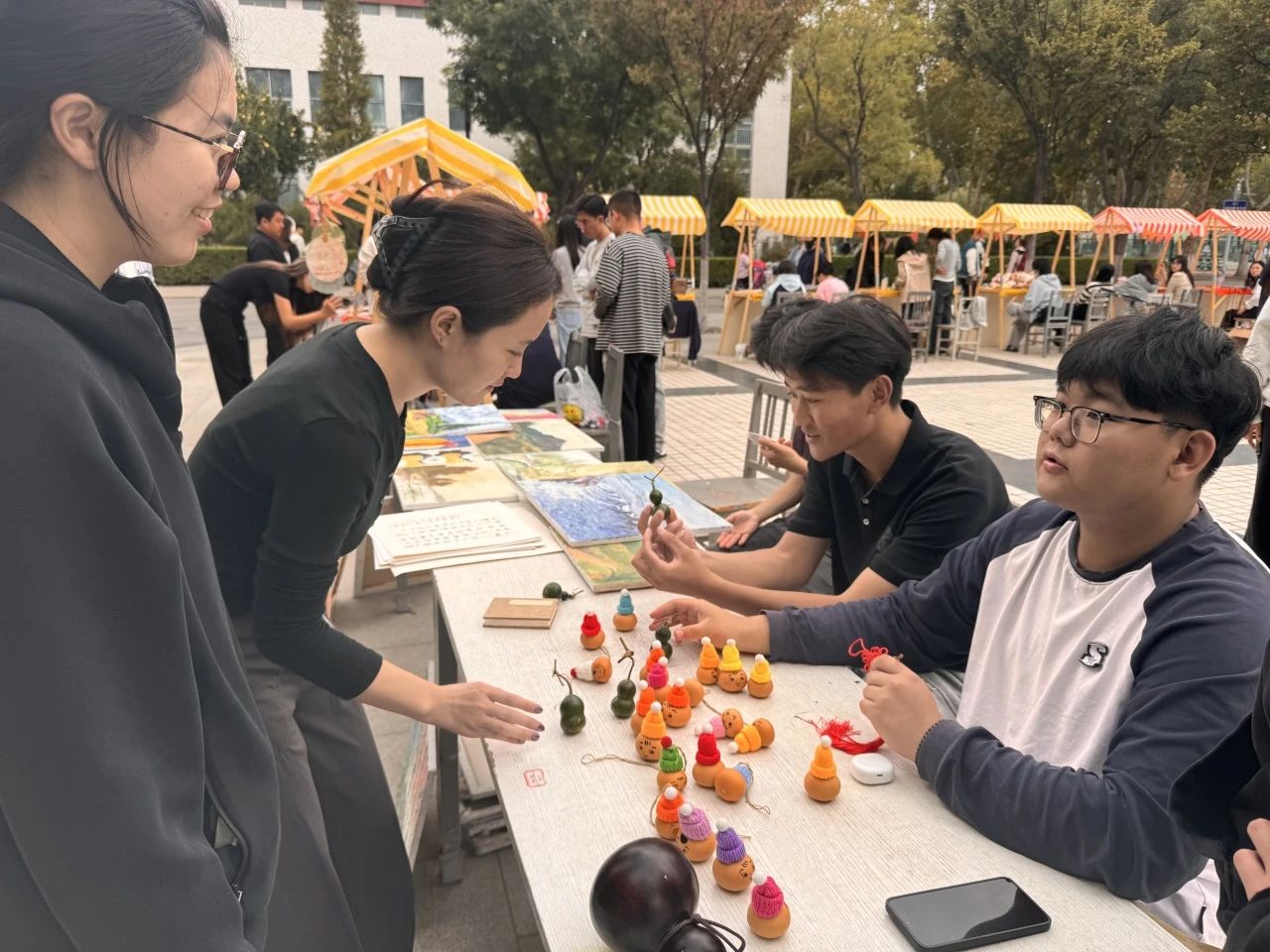 这里是灵感的汇聚地,每一个摊位都承载着同学们的无限创意。瞧,那精美的漆扇,色彩斑斓,扇面之上的图案或古典雅致,或现代时尚,轻轻摇动,仿佛能扇走所有的烦恼,带来一抹艺术的清风。还有小巧玲珑的文小葫芦,被赋予了各种奇妙的图案和寓意,或可爱俏皮,或庄重神秘,拿在手中,让人爱不释手。精致的相框也是一大亮点,它们不仅仅是用来装裱照片的工具,更是一件件独特的艺术品,设计独特,工艺精湛,为你的珍贵回忆增添一份别样的魅力。