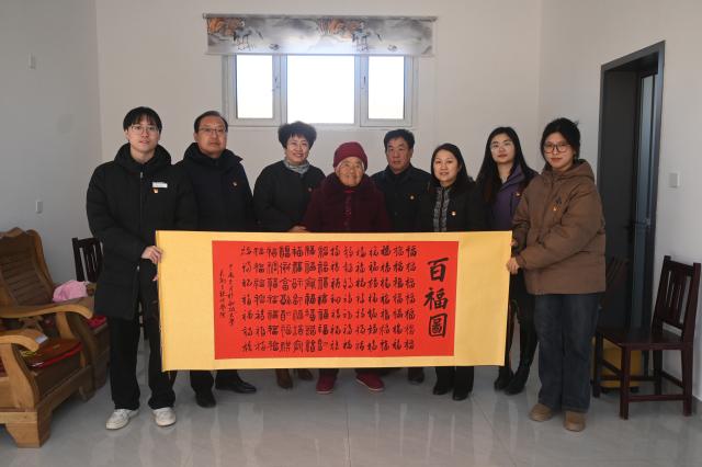 戴里庄村的黄立英和范之贞两位老人这天正好分别过93岁和84岁生日,支部书法专业学生党员专门为老人们书写了“百福图”,并用学生党支部自发组织的“美益角”基金购买了年货,一起为她们送上最真诚的祝愿。支部自2024年3月联建共建启动以来,已经为28位80岁以上老人送去了“百福图”,同时也送出了28份美好的祝福。