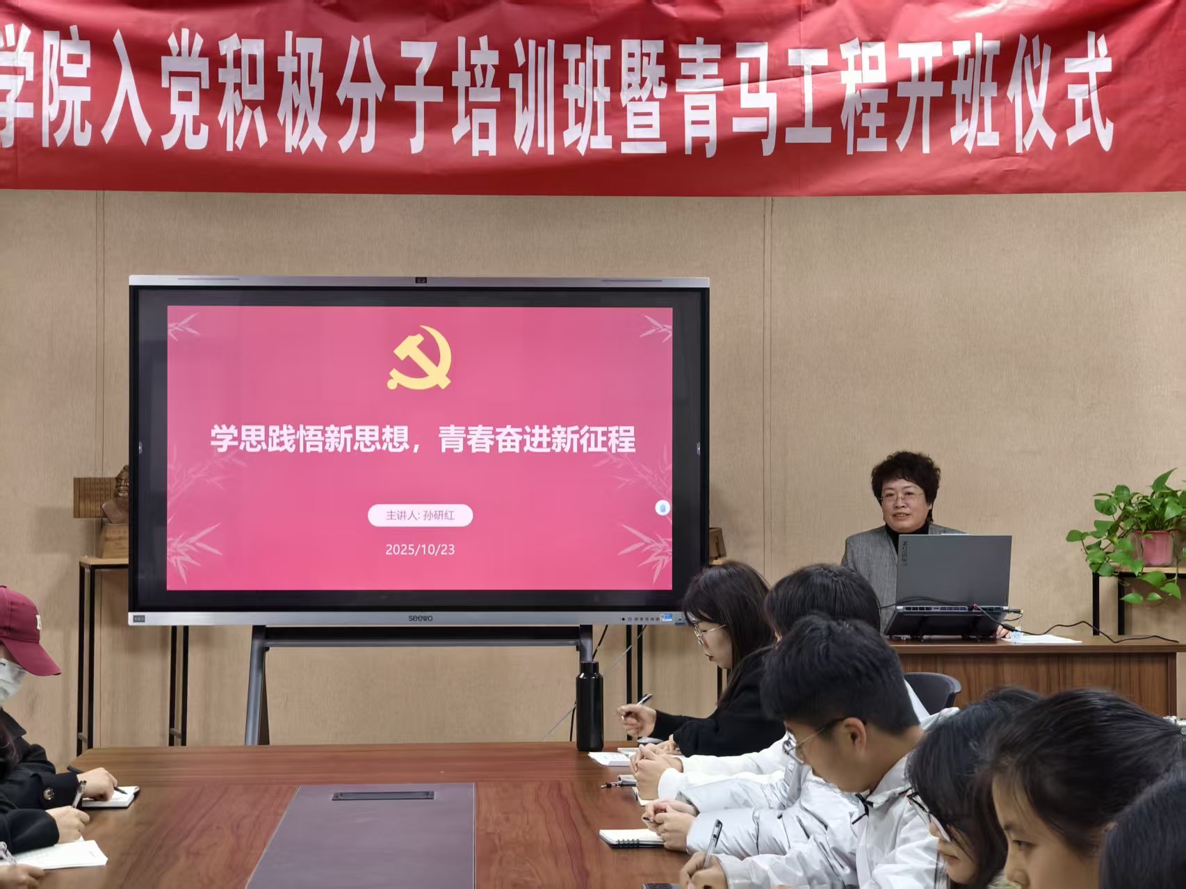 孙研红以“学思践悟新思想,青春奋进新征程”为主题,从强化理论学习、锤炼自身技能、发挥模范作用三方面展开阐述,教育入党积极分子端正入党动机、提高思想认识、加强政治理论学习,确立为共产主义事业奋斗终身的信念。孙研红指出,作为学生入党积极分子要用理论武装头脑、指导行动,努力提升政治素养,增强行动自觉,在实践中锤炼党性、发挥先锋模范作用,以一名党员的标准严格要求自己,积极进取,不断进步,争取早日加入党组织。