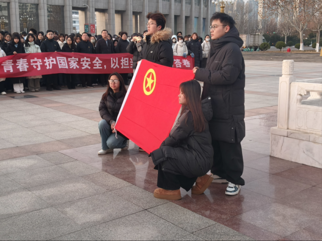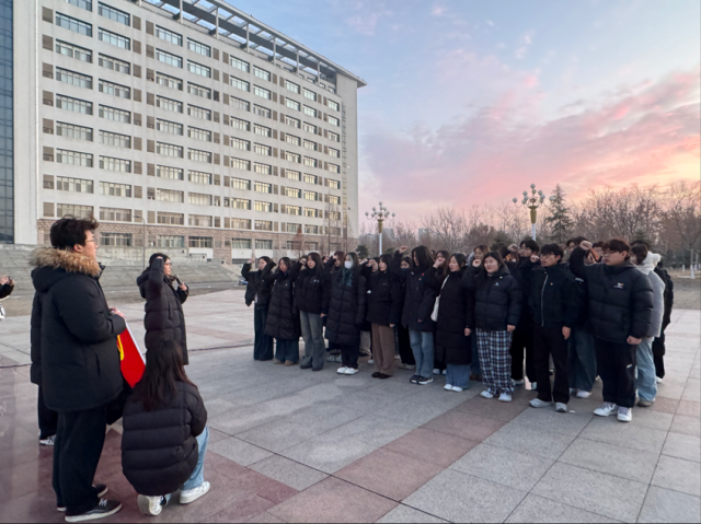 仪式在雄壮的国歌声中拉开序幕,五星红旗迎着朝阳冉冉升起,随后,《光荣啊,中国共青团》的旋律激昂响起,新团员们用嘹亮的歌声唱出对团组织的向往与崇敬。紧接着,团员代表吴菲菲同学站在队伍前方,神情庄重地举起右拳,带领全体新团员庄严宣誓。每一句誓词都掷地有声,每一个眼神都坚定无比,这不仅是一份承诺,更是新团员们肩负起时代使命的决心。他们以拳为誓,将初心镌刻心底,以青春之名,赴时代之约。