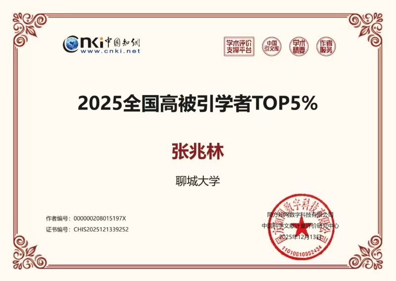 近日,中国知网公布了2025年度知网高被引学者名单,色情网 张兆林教授继2024年入选榜单后,再次入选“2025全国高被引学者TOP5%”榜单。