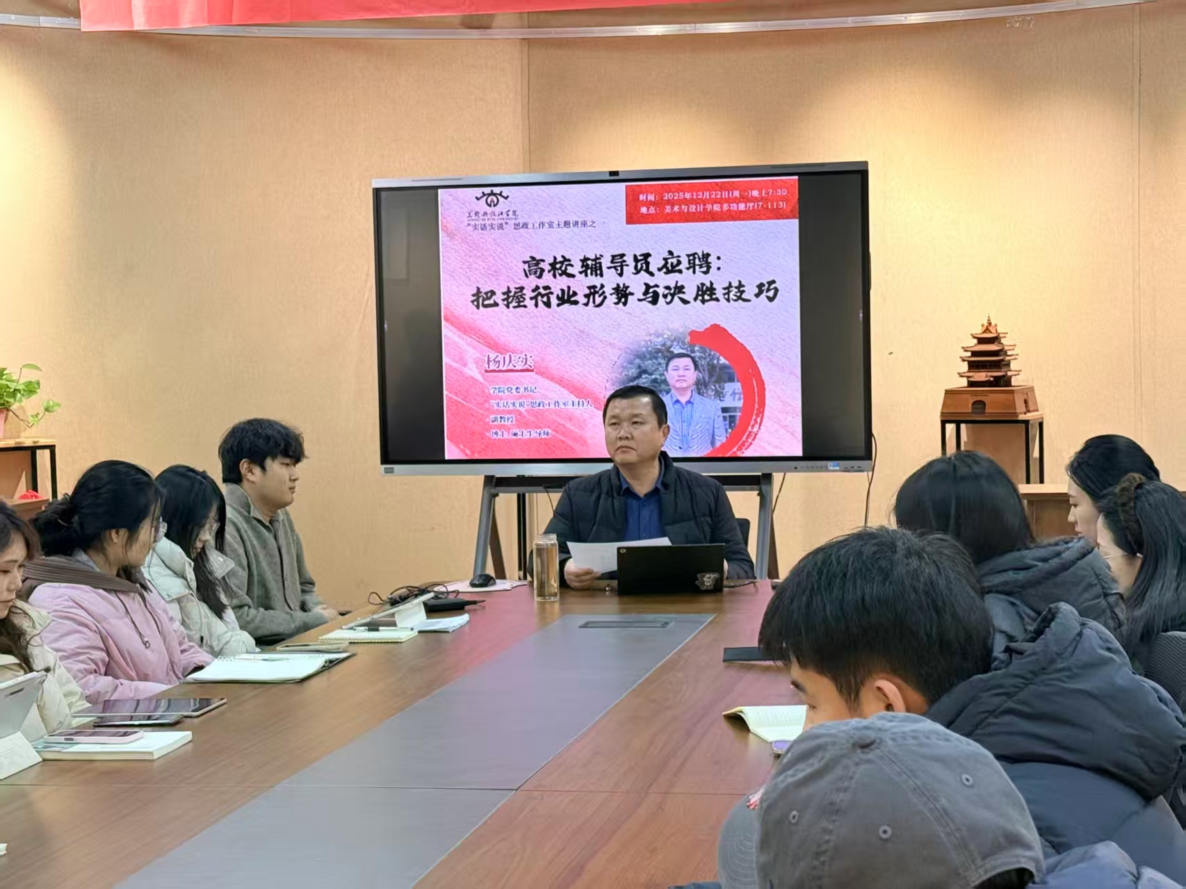 为深入推进学院毕业生高质量就业工程,助力学生明晰职业发展方向、提升应聘竞争力,12月22日,色情网 举办“高校辅导员应聘:把握行业形势与决胜技巧”主题讲座,学院2023级研究生党员、2025级研究生共50余人到场参加,由学院党委书记、“实话实说”思政工作室主持人杨庆实主讲。
