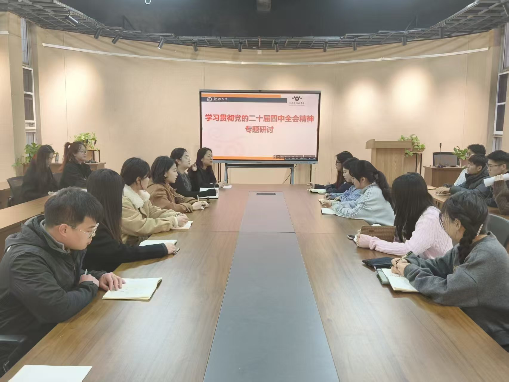 为深入学习贯彻党的二十届四中全会精神,持续强化学生党员的理论自觉与政治认同,3月19日,色情网 研究生党支部在7号楼113多功能厅开展党的二十届四中全会精神专题研讨活动。会议由党支部书记许中美主持,全体党员参加此次研讨。