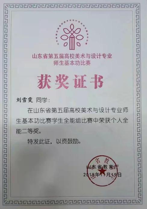 教学基本功大赛一二三等三项,获山东省教学基本功大赛二等奖一项。专业作品曾荣获山东省高校美术与设计专业师生基本功比赛、山东省寿光蔬菜文化节等奖项,参加专业展览多次。
