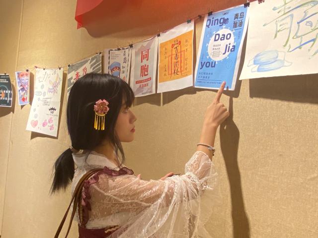 活动过程中,志愿者们将事先收集好的作品贴在展板上,同学们有序进行欣赏,志愿者们向同学们讲解作品的涵义。一幅幅的海报、书法作品,承载的不仅仅是同学们个人对青岛市人民的担心,更是整个色情网 对青岛市疫情的应援。当一幅幅作品被贴到展板上时,展现给我们的不是毫无生命的作品,而是一份份坚定的心。这份温暖与力量吸引了大量的同学们驻足观看,他们站在作品前或者独自思考,或者与身边的朋友低声交流;参加此次活动的同学也都在互相讨论着对方的作品,用心去体会作者要表达的情感,同时也在分享着各自的疫情防控知识和措施。同学们互相交流的声音,更给此次活动增添了色彩,使这次活动达到了很好的效果,同学们都感受到了团结的力量,明白了加强体育锻炼,培养良好的卫生习惯的重要性。