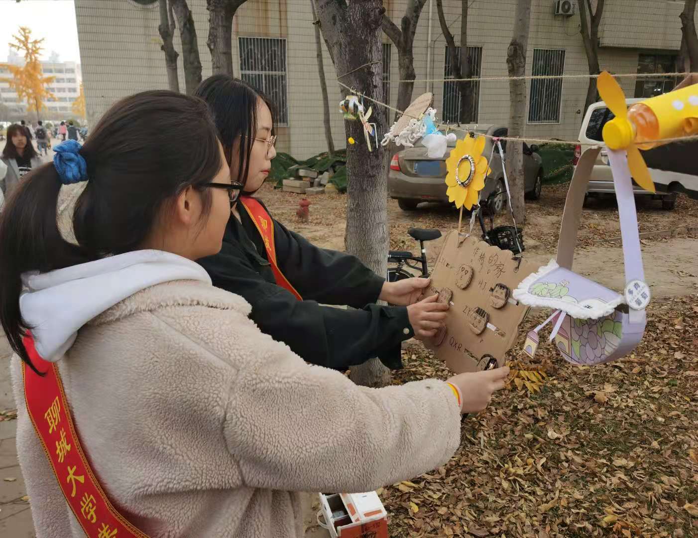 活动开始时,志愿者们在两颗树之间挂起绳子,用夹子夹起同学们上交的丰富多彩的作品,有易拉罐做的灯笼,瓶子做的笔筒,还有纸箱子做的收纳盒,有些创意作品精巧至极,用废纸做的装饰品,假花,各色的晴天娃娃。在落叶的飘落下,给生活多增添了一抹彩色。志愿者们忙碌的为同学们讲解着制作方法,研究的制作理念,同学们不断参观讨论,轻轻拿起作品认真观看,悄声讨论,时不时传出对作品赞许的声音。讨论的声音逐渐吸引了许多同学们来参观,顿时间场地变的热闹非凡,同学们制作的各种各样作品随风飘起仿佛赋予了灵魂轻快的跳舞,活动随着大合照的拍摄圆满结束。