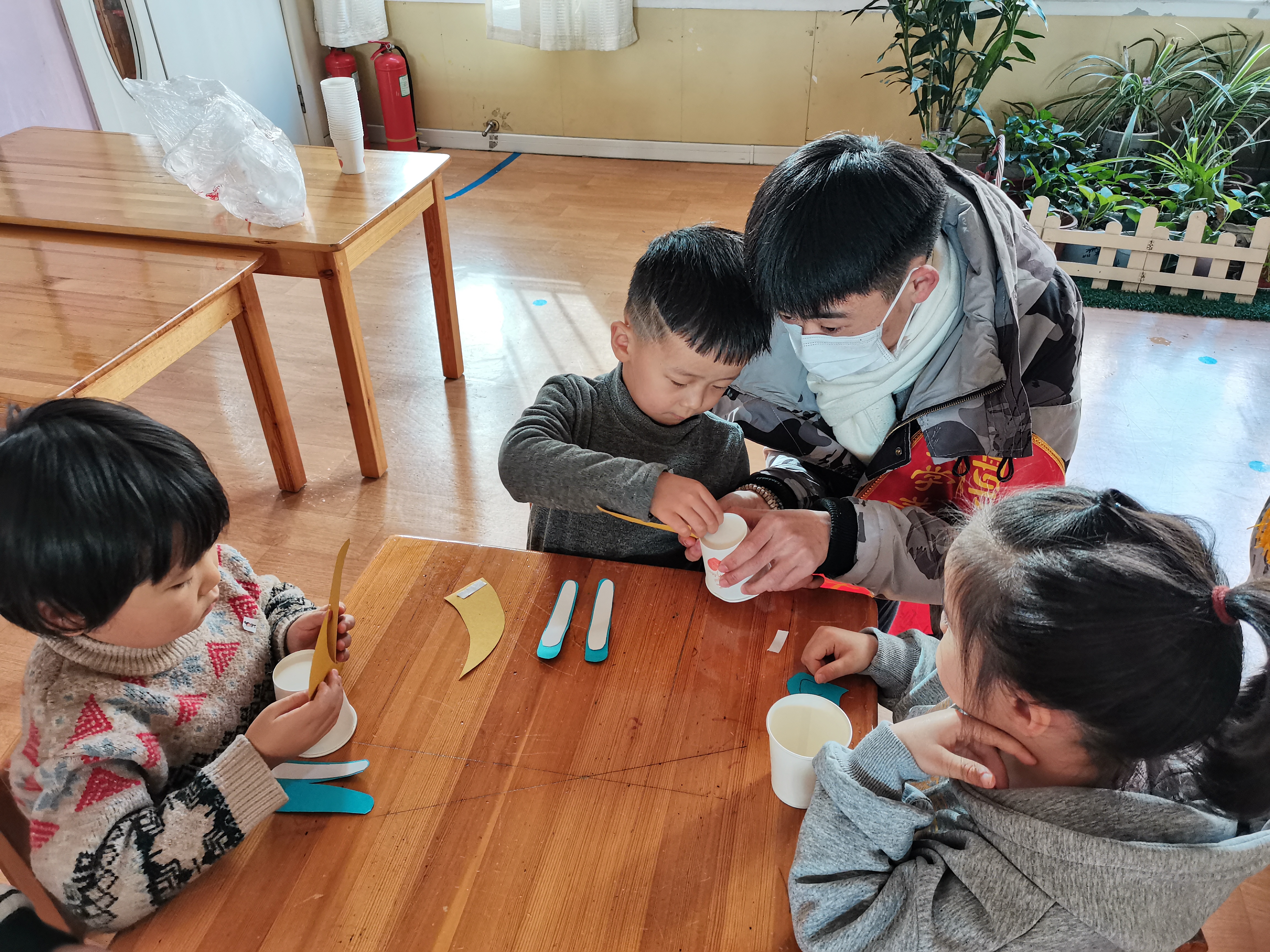 “阳光计划”志愿服务队负责人准备好了一次性纸杯和彩纸,准备和孩子们一起完成金牛手工制作。他们仔细认真地教小朋友们如何制作,用和蔼可亲的话语与小朋友们交流。在手工制作中教小朋友们一些关于生肖的知识,这样的教育方式会让小朋友们对生肖的认识更加深刻。小朋友们有了志愿者的陪伴,我们发现他们会表现出不一样的快乐容颜。