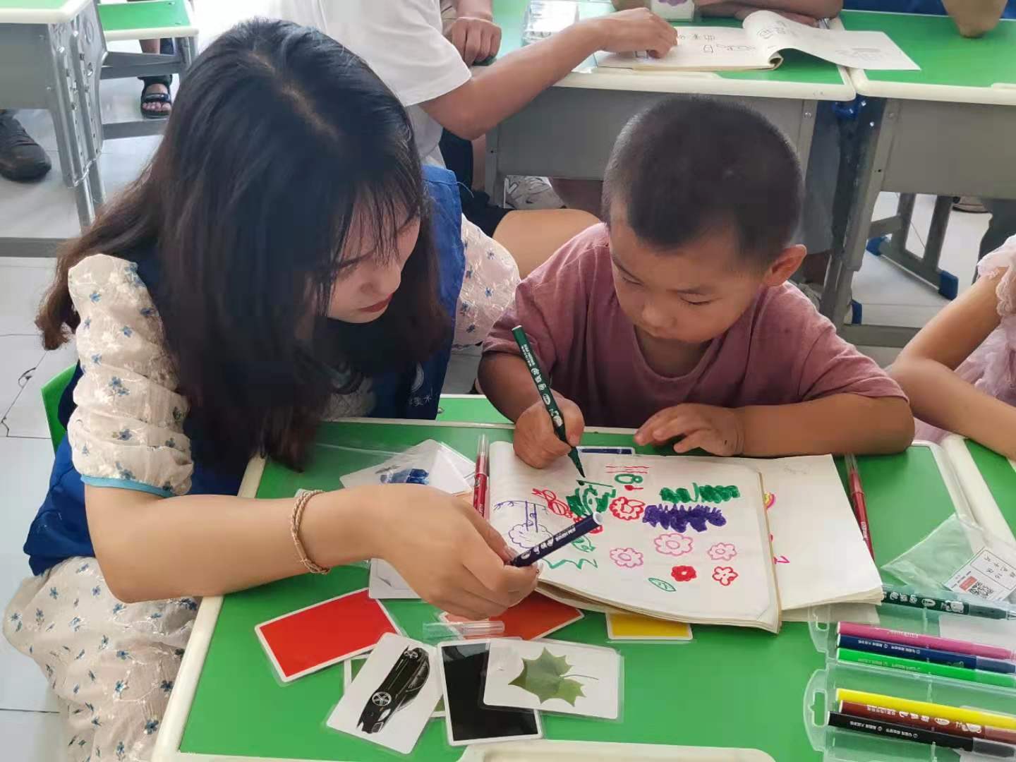 “与美同行”志愿服务协会深刻着互助精神,它提倡“互相帮助、助人自助”。志愿者凭借自己的双手、头脑、知识、爱心开展各种志愿服务活动,帮助那些处于困难和危机中的人们。正如协会的长期项目:“美术治疗——关爱自闭症儿童综合能力提升”,每周六我们都会去教小朋友们上课,从一开始他们不会跟我们交流,到渐渐的,开始有小朋友跟志愿者们打招呼,开始跟志愿者们交流,谈论着他们画在纸上的飞机大炮;看着各式各样的小卡片,面对志愿者的提问,会举一反三。他们逐渐打开自己的世界,开始接受来自这个世界的善意。这不是一日而成,是一年又一年,一届又一届的志愿者们,用自己的善意和耐心,用自己的努力与付出,完成了一个又一个的不可能!