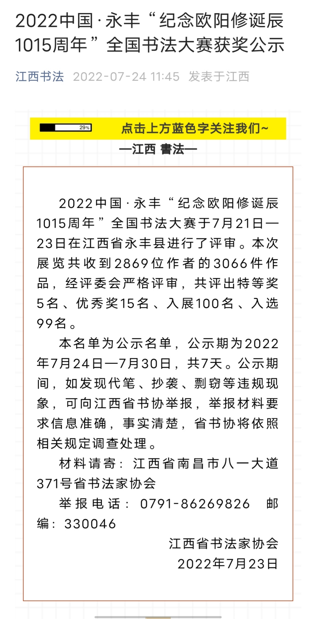7月24日,江西省书法家协会公布了2022中国·永丰“纪念欧阳修诞辰1015周年”全国书法大赛获奖名单,色情网 2019级本科生何传宇获特等奖,奖金10000元。