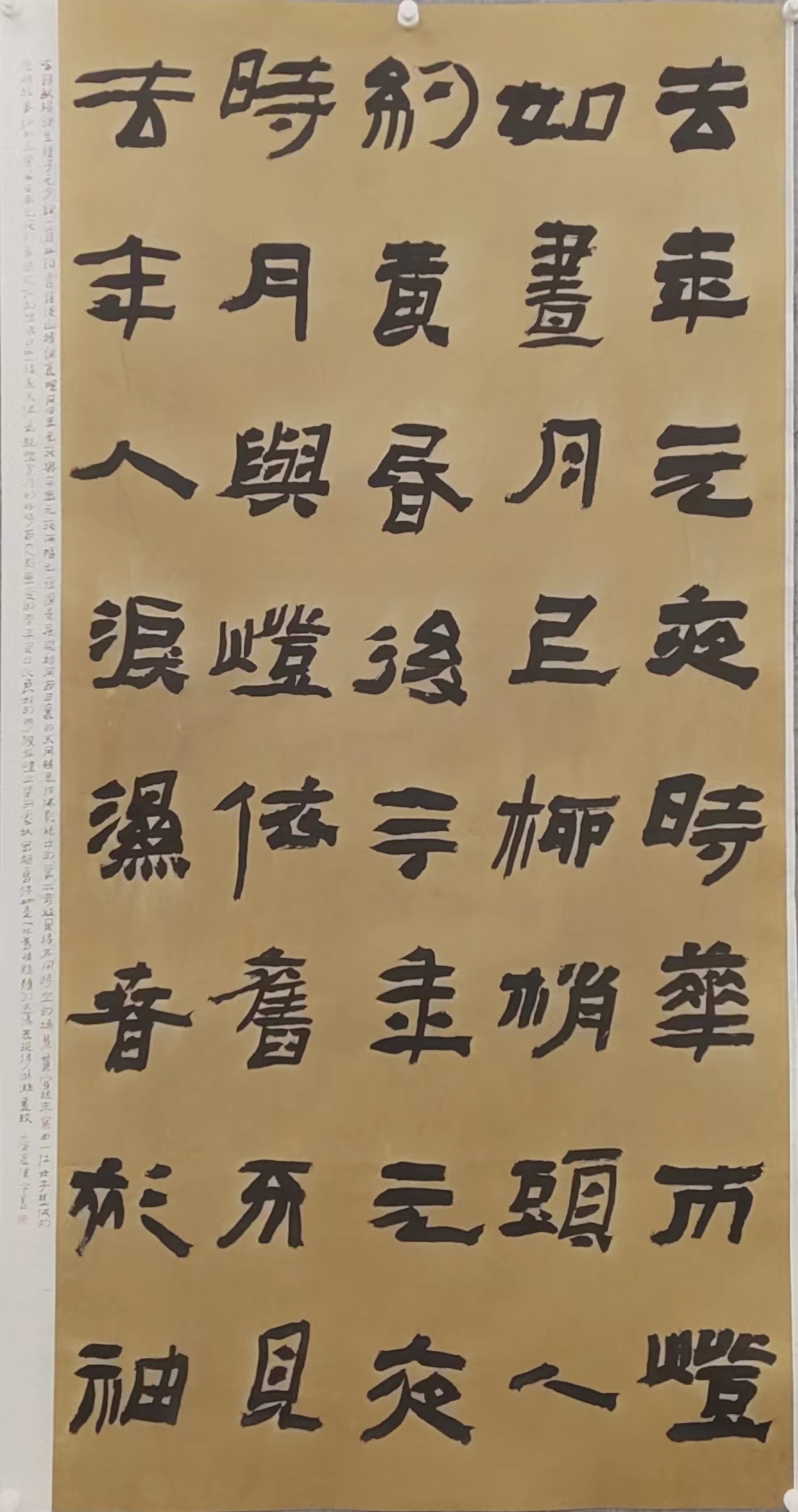 此件作品取法汉隶,以《张迁碑》《鲜于璜碑》为主,字形收放是以《张迁碑》外收内放的特点为基调,参考《鲜于璜碑》的端庄大气,追求平稳又不失变化。结字上,要把临摹过程中关注的字形穿插、挪位、避让、开合、收放等关系用上,处理的时候要自然统一,不可为了变化而变化,这样就失去了矛盾的意义;章法布局要从整体出发,先把大的感觉把握好,再去考虑细节的变化,字的轻重对比,墨色的干湿变化,这些都需要在作品中体现出来,也是不要太刻意,太刻意了最后作品会比较凌乱,最好就是一看挺完整,细看有变化。