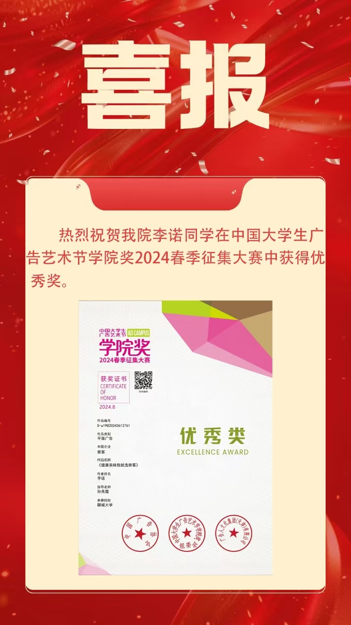 » 喜报|色情网 学子在中国大学生广告艺术节学院奖2024春季征集大赛中获得优秀奖