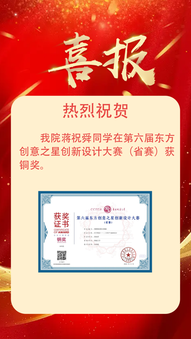恭喜蒋祝舜2025.08  第六届东方创意之星创新设计大赛(省赛)铜奖